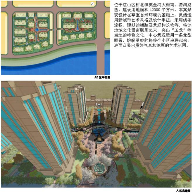 本項目位于紅山區橋北鎮英金河大街南、清河路西。建設用地面積42000平方米。本案景觀設計在尊重自然環境的基礎上,靈活運用新裝飾藝術風格及設計手法,采用線條流暢、硬朗的鋪裝及景觀構筑物等,將該地域文化緊密聯系起來,突出“玉龍”等當地的特色文化,中心景觀運用一條龍型飄帶,蜿蜒曼妙的將整個小區串聯起來,進而凸顯出貴族氣息和濃厚的藝術氛圍。